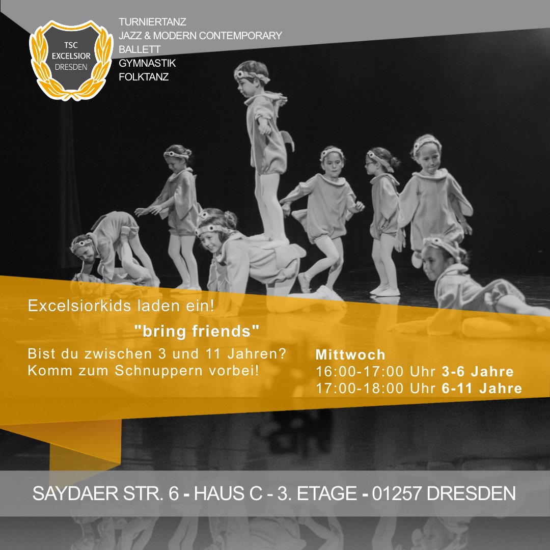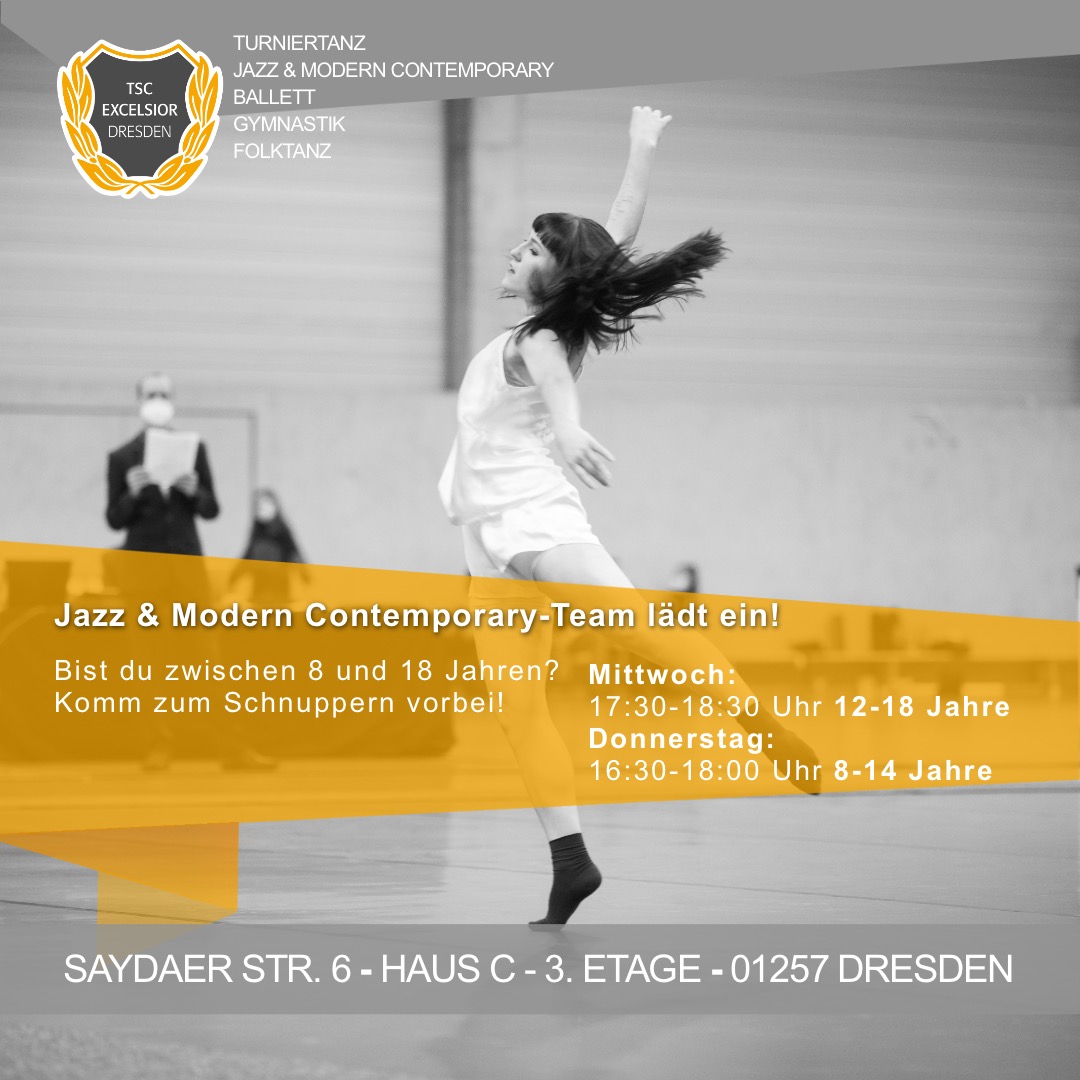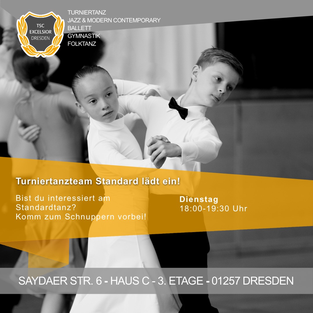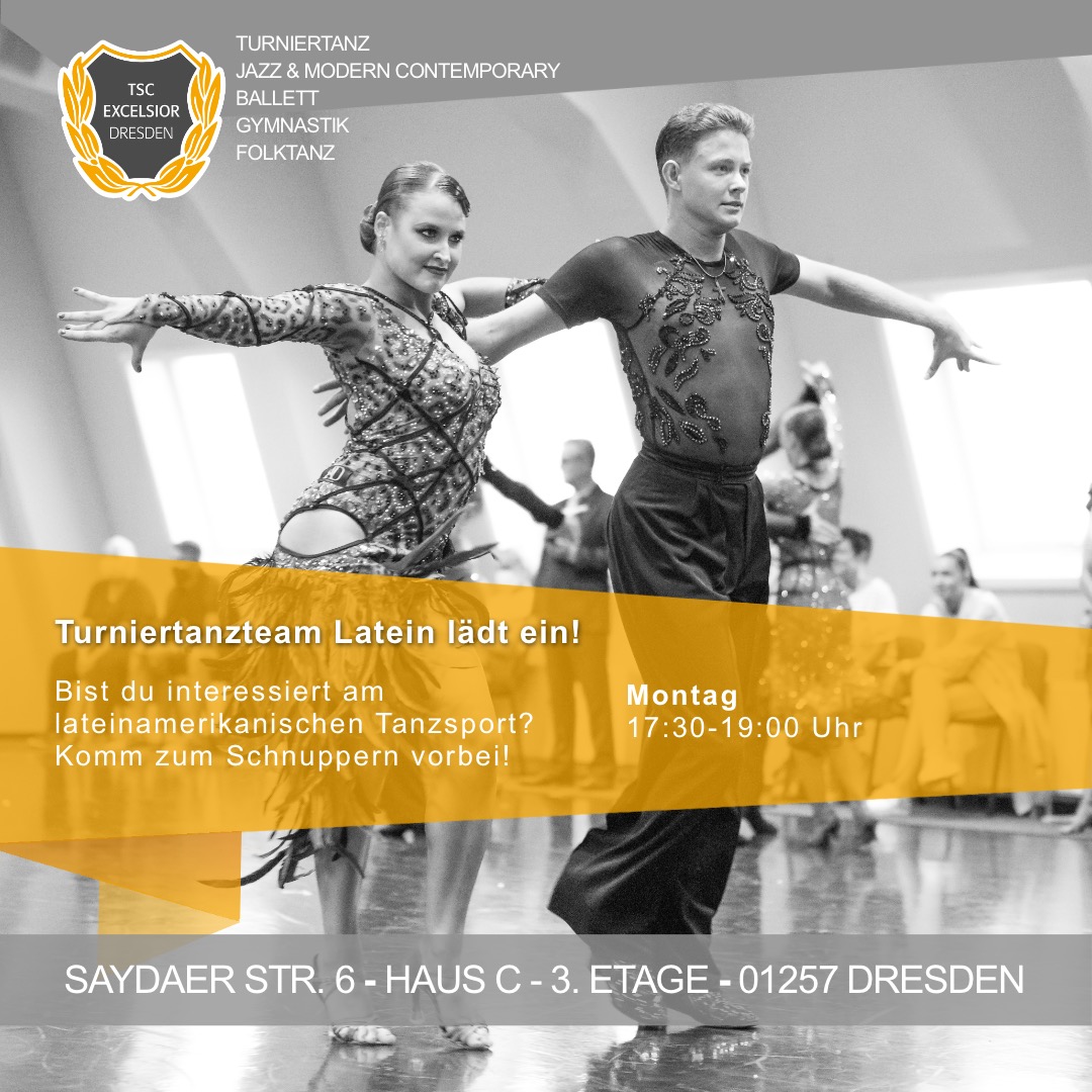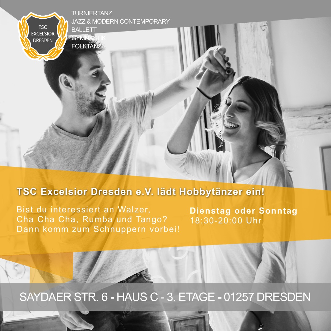 Der TSC Excelsior Dresden e.V. lädt Dich, deine Freunde und andere Tanzinteressierte zum schnuppern und probetrainieren ein. Ob im Standard-/ Lateintanz oder im Bereich Jazz & Modern/ Contemporary sind interessierte Kinder-, Hobby- oder Turniertänzer bei uns herzlich willkommen.